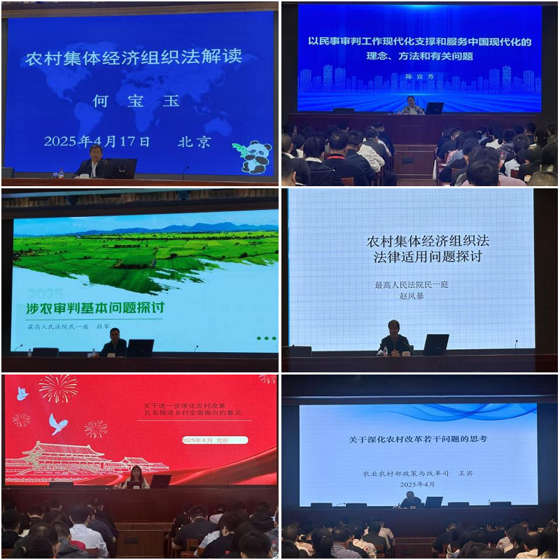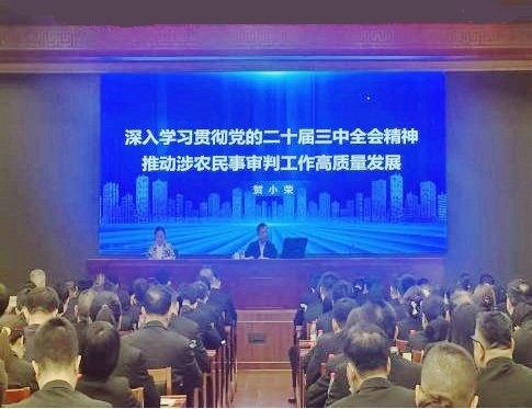 最高人民法院党组成员、副院长贺小荣出席培训班并就学习贯彻党的二十届三中全会精神,健全公正执法司法体制机制作主题报告。全国人大农业与农村委员会办公室原主任何宝玉,最高人民法院民事审判第一庭庭长陈宜芳、副庭长杜军、二级高级法官王丹、三级高级法官赵风暴等对农村集体经济组织法重点内容进行详细解读,对新法实施、涉农审判、纠纷适用等方面热点问题进行答疑解惑。中央财办(中央农办)经济九局副局长吴晓佳、农业农村部政策与改革司副司长王宾围绕贯彻落实中央一号文件,稳步推进农村改革进行政策辅导。此外,培训班还进行了新法贯彻落实相关工作交流。