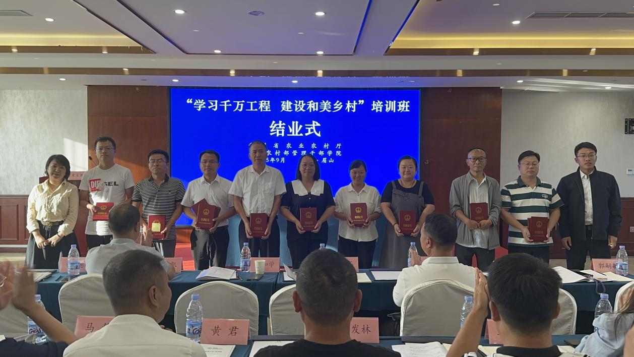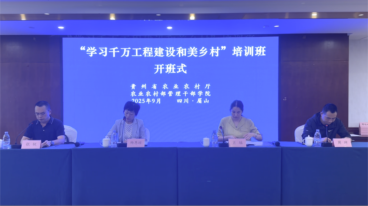 2025年9月22日至26日,由贵州省农业农村厅主办,农业农村部管理干部学院承办的“学习千万工程 建设和美乡村”培训班在四川眉山顺利举办,贵州省农业农村厅总农艺师杨恩琼、农业农村部管理干部学院农村土地经营管理服务中心主任肖瑶、眉山市农业农村局副局长张锐出席开班式并讲话,贵州省农业农村厅乡村建设副处长、农村人居环境保护管理站负责人周琦主持开班式。来自贵州省各市州87个县、市、区(云岩区除外)“两清两改两治理”工作推进乡镇副职及村支部书记共100人参加了培训。