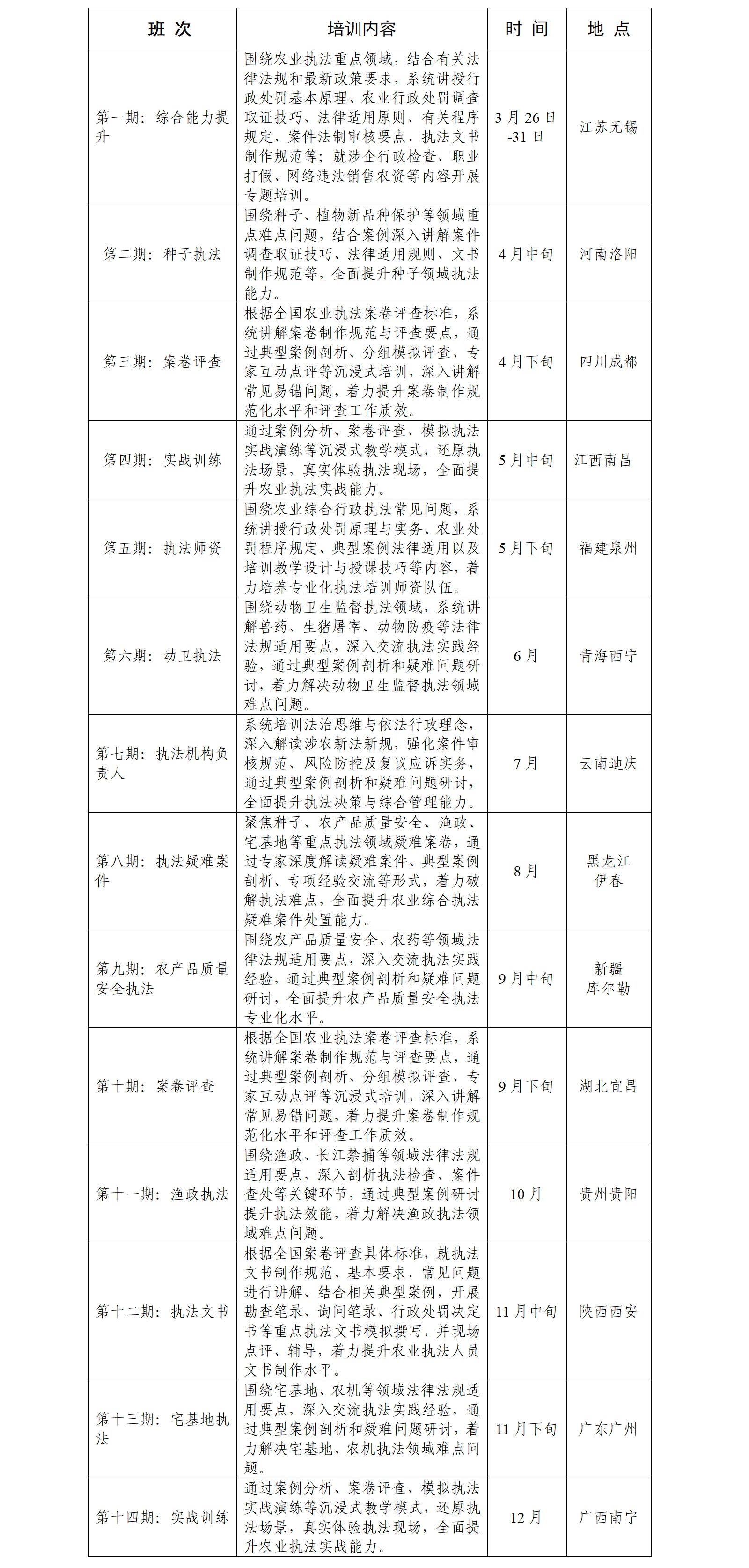 为贯彻落实中央关于深化农业综合行政执法改革的决策部署和《农业农村部关于加强农业行政执法培训工作的指导意见》《农业农村部办公厅关于加强农业综合行政执法队伍作风建设的通知》等相关文件要求,助力全面提升农业综合行政执法人员能力素质,打造一支政治信念坚定、业务技能娴熟、执法行为规范、人民群众满意的农业综合行政执法队伍,农业农村部管理干部学院拟于2025年举办14期农业综合行政执法能力提升培训班。现将有关事项通知如下。