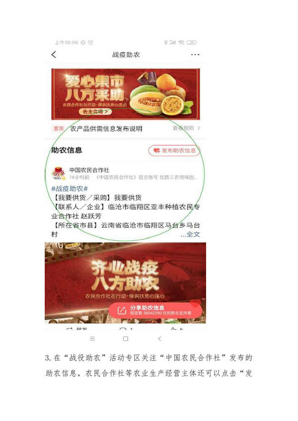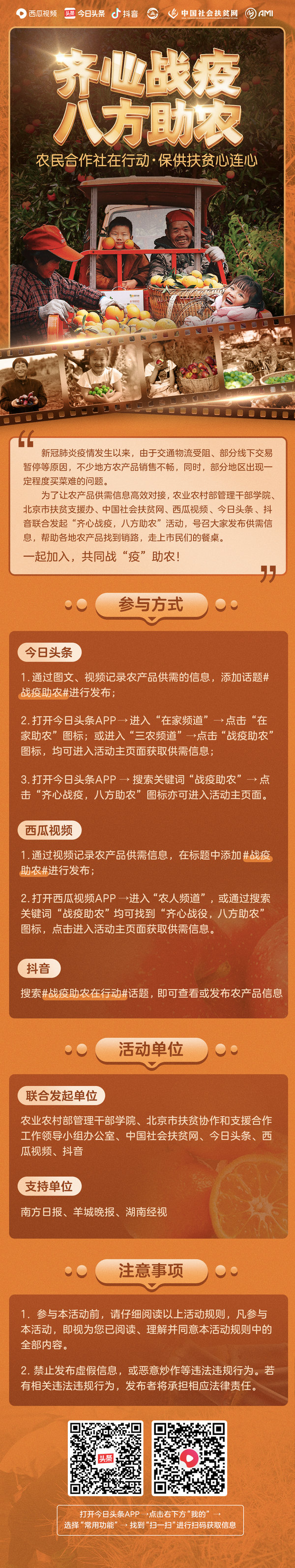 农民合作社等主体也可通过今日头条、西瓜视频添加#战疫助农#话题,通过抖音添加话题#战疫助农在行动#,进行农产品供需信息发布。经核实后,平台将为优质农产品供需信息进一步提供流量和曝光支持。