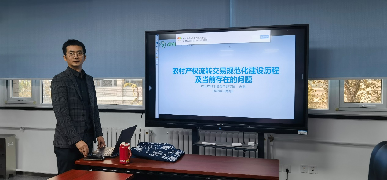 占鹏博士长期从事农村产权流转交易研究,曾于2022年至2023年在农业农村部政策与改革司农村产权交易指导处借调工作,全程参与了农村产权流转交易规范化试点相关文件的起草、评审与推进工作,具备扎实的理论功底和深入的政策研究与实践经验。此次活动,他主讲了《农村产权流转交易规范化建设历程及当前存在的问题》这门课程,系统梳理了我国农村产权流转交易规范化建设的发展脉络,结合大量关键政策文件与详实数据,清晰展现了制度演变的历史逻辑。并进一步结合其参与顶层设计的实践,对当前正在进行的全国性规范化试点工作的背景、目标、任务与最新进展进行了解读。最后,课程直面行业发展瓶颈,结合各地实际,深度剖析了当前工作中存在的难点与问题。其讲解逻辑清晰、内容翔实,既有理论高度,又贴近基层实际,展现了其对教学内容的深刻理解与扎实的专业功底。