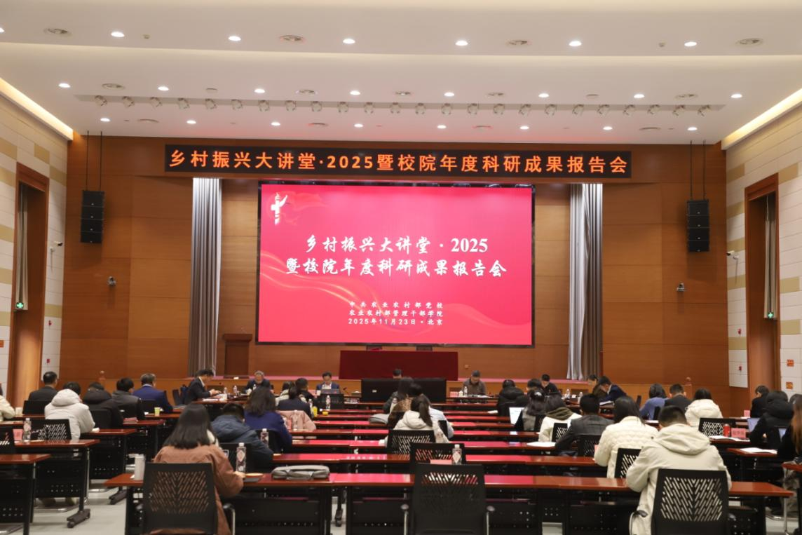 为深入学习贯彻党的二十届四中全会精神,坚守“为党育才、为党献策”党校初心使命,推动新时代校院事业高质量发展,近年来,农业农村部管理干部学院(中共农业农村部党校)以习近平新时代中国特色社会主义思想为指导,贯彻落实部党组部署要求,以学科建设为抓手,推动有组织科研,聚焦“加快农业农村现代化,扎实推进乡村全面振兴”进程中的重大理论和现实问题,深入学习习近平总书记关于“三农”工作的重要论述,形成了一批高质量研究成果。11月23日,校院举办“乡村振兴大讲堂·2025暨校院科研成果报告会”。农业农村部农村经济研究中心主任赵长保研究员,中国人民大学党委常委、常务副校长、长江学者朱信凯教授,中国社会科学院农村发展研究所纪委书记、副所长、国家级人才获得者郜亮亮研究员,中国人民大学农业与农村发展学院院长、中宣部“宣传思想文化英才”吕捷教授等领导专家出席报告会。北京社科规划办有关同志在线参加相关环节活动。农业农村部管理干部学院党委书记、部党校常务副校长向朝阳出席并致辞,墨丹副院长出席报告会,高文永副院长主持报告会。