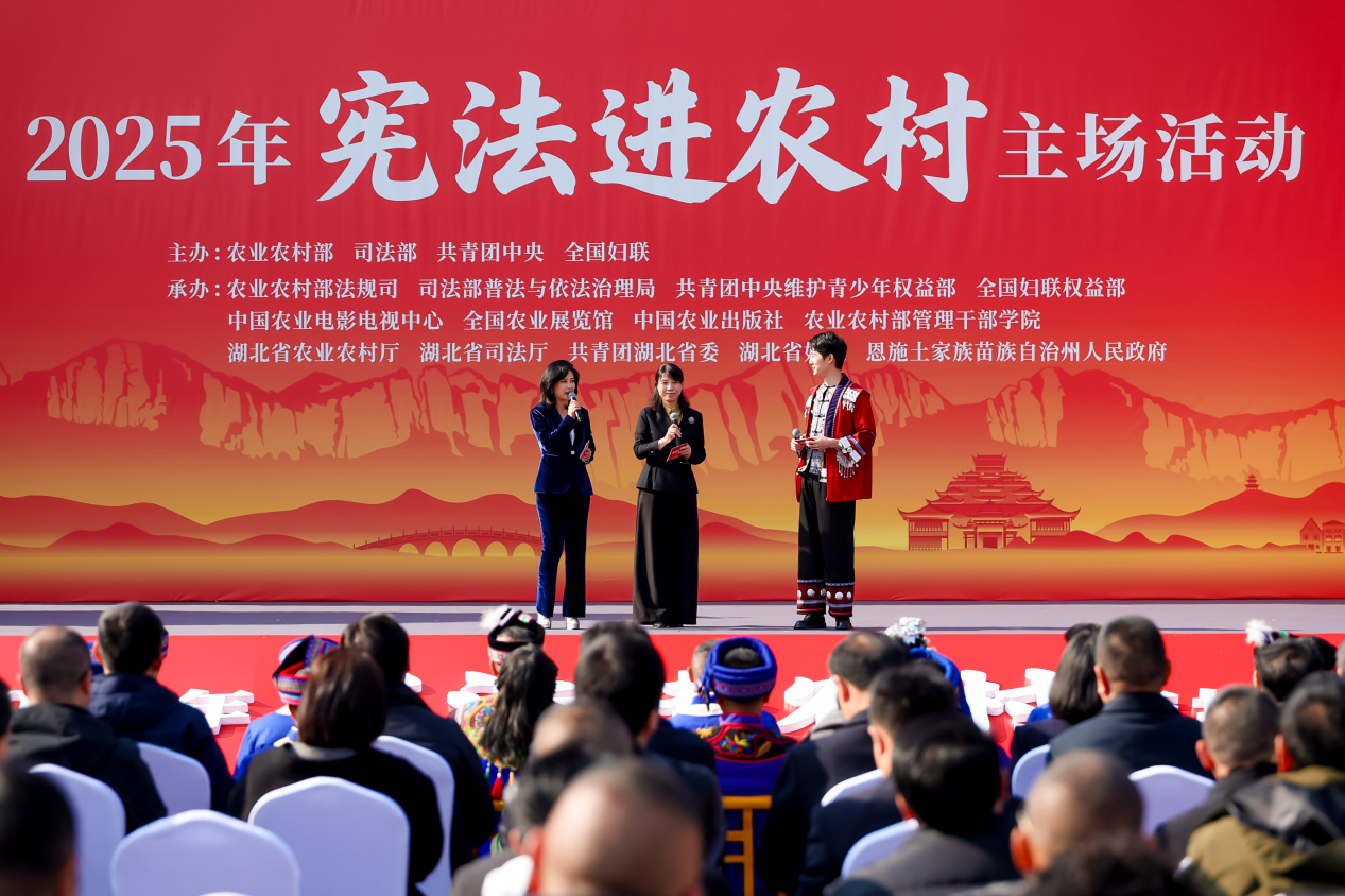 12月5日,农业农村部、司法部、共青团中央、全国妇联在湖北省恩施土家族苗族自治州宣恩县黄坪村共同举办2025年“宪法进农村”主场活动。活动坚持以农民为主体,突出面向农民、服务农民、以农民群众喜闻乐见的方式阐释宪法法律知识,让宪法法律进村入户,走进田间地头。
