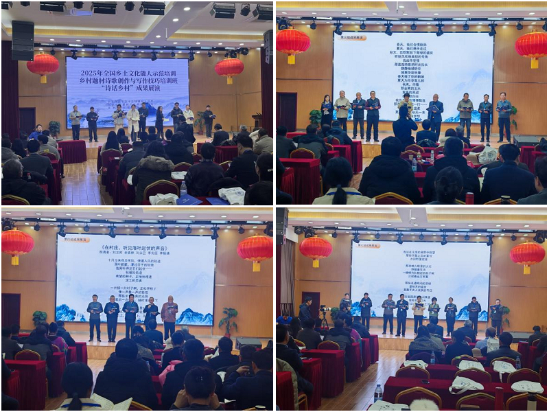 随后,全体党员来到仙人洞村乡村文化振兴示范基地,现场观看了 2025 年全国乡土文化能人示范培训乡村题材诗歌创作与协作技巧培训班 “诗话乡村” 成果展演。展演中,学员们分组登台,以诗朗诵的形式生动展现乡村发展新貌、文化传承脉络,真挚的情感与鲜活的表达赢得了在场观众阵阵掌声。大家认为,通过专题培训班成果展演的创新模式可以让学员更加直观感受到乡村文化振兴的丰硕成果,激发学员深耕乡土文化、创作惠民诗歌的热情,自觉承担起乡村文化的传承重任,在挖掘文化内涵、赋能乡村发展中彰显更大作为。