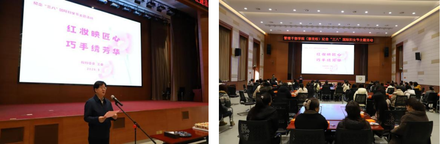 春风送暖,巾帼绽芳。3月6日,校院举办“红妆映匠心 巧手绣芳华”庆祝“三八”国际妇女节主题活动。院党委书记向朝阳出席活动并致辞。全体在家院领导、校院130余名女职工、霍营街道妇联相关同志及校院男职工代表欢聚一堂,共庆节日。