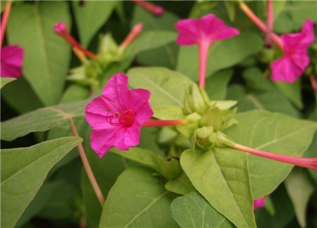 形态特征 一年生草本植物,茎直立多分枝,叶片卵形或卵状三角形,花常数朵簇生枝端;花紫红色、黄色、白色或杂色,高脚碟状,花午后开放,有香气,次日午前凋萎;花期6-10月,果期8-11月。